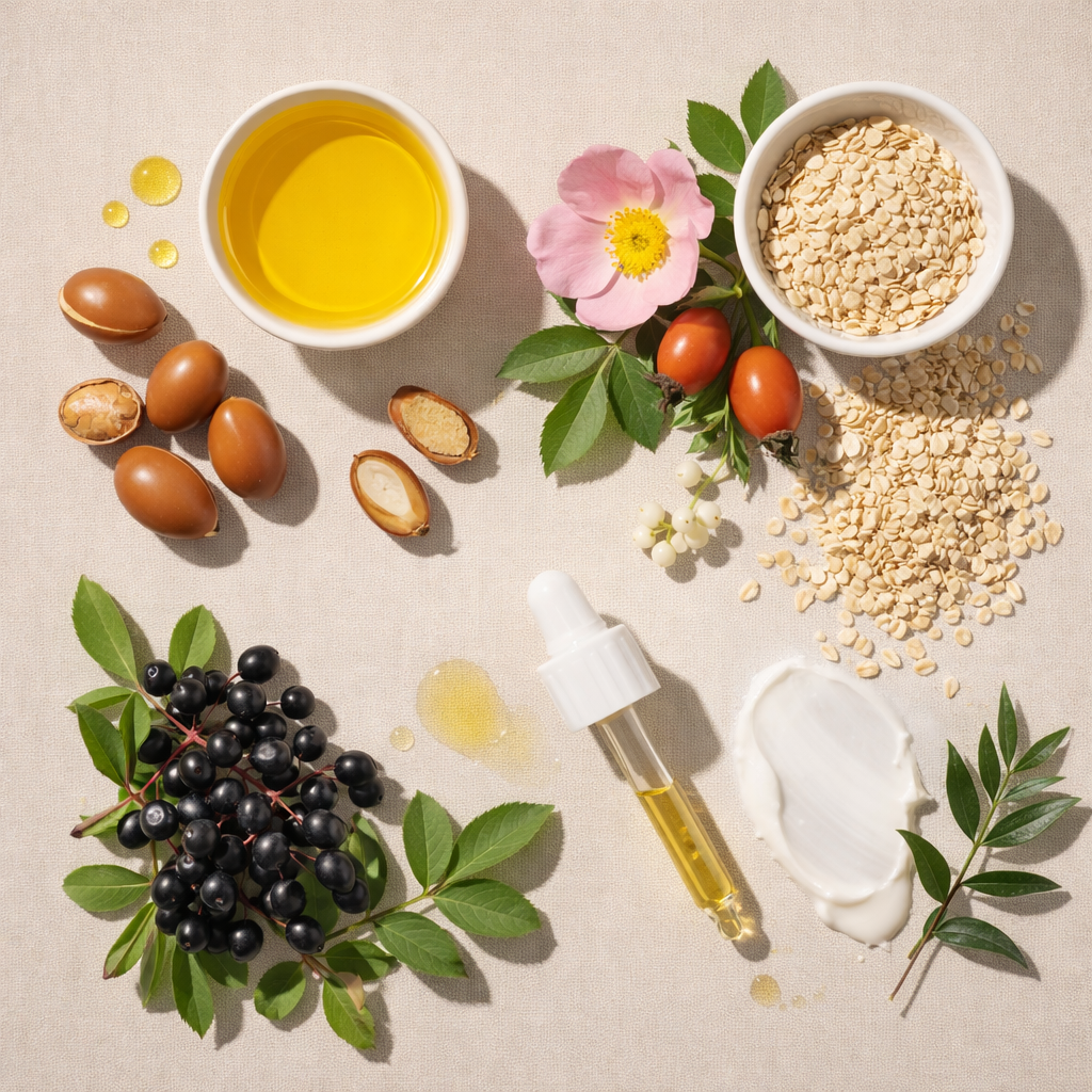 Huile d’argan riche en acides gras essentiels, jojoba biomimétique, rose musquée régénérante, extraits de sureau et d’avoine apaisants, vitamine E antioxydante, peptides et actifs d’origine végétale soigneusement dosés et bien plus encore!
